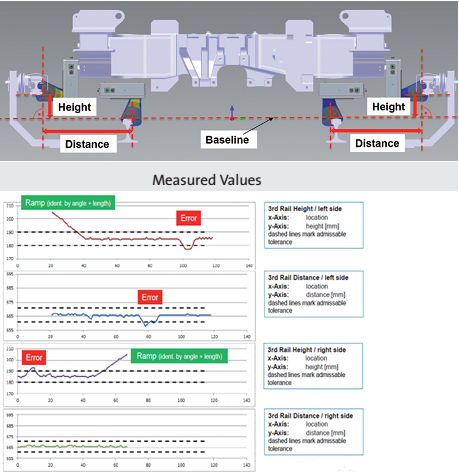 测试结果展示了图形化测量数值并突出了大偏差的错误点。升高、下降线条代表了第三方铁轨的形状分布并给予了明确的图像显示。